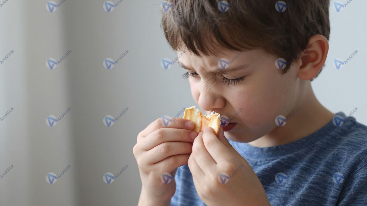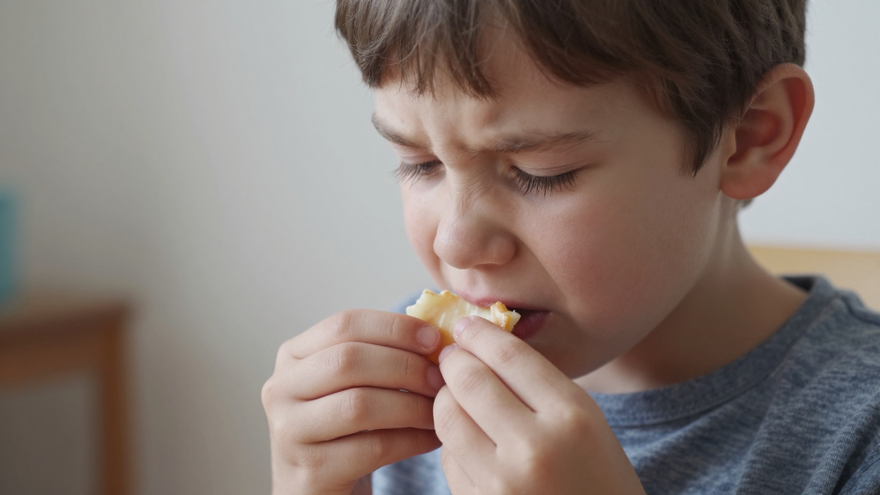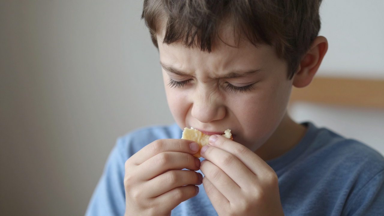 Ребёнок нюхает испорченную еду, отвращение.
