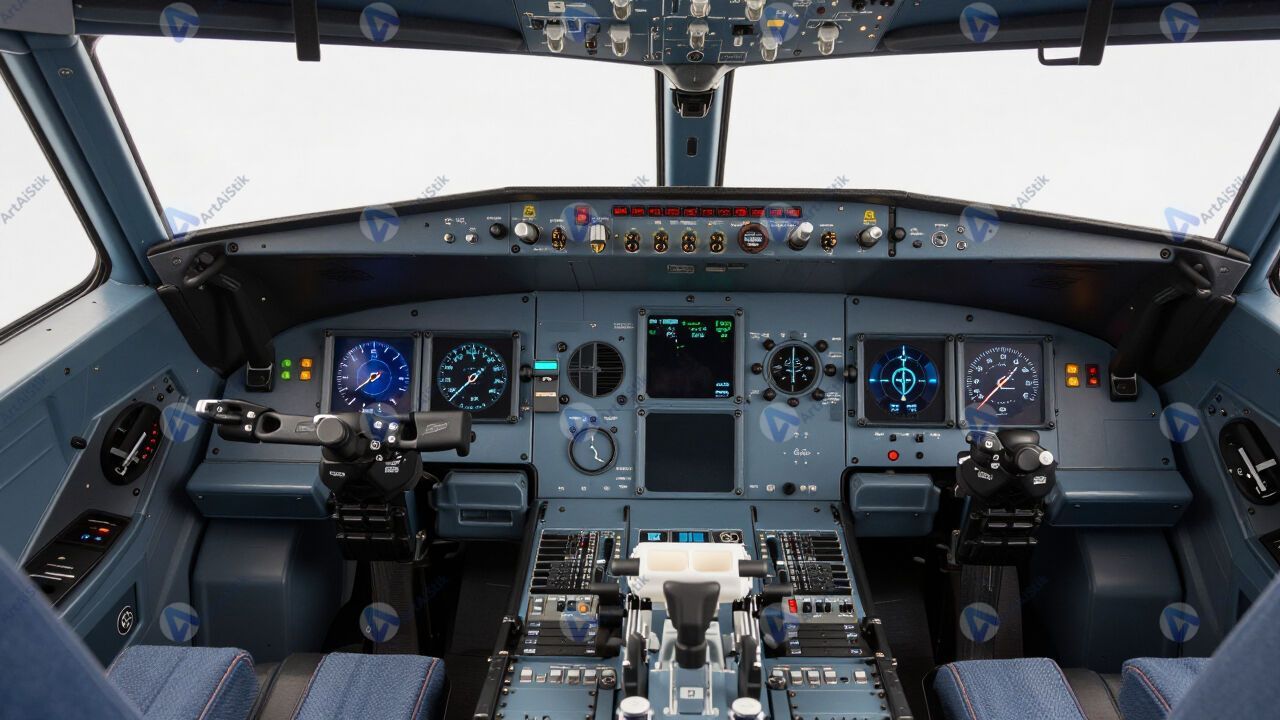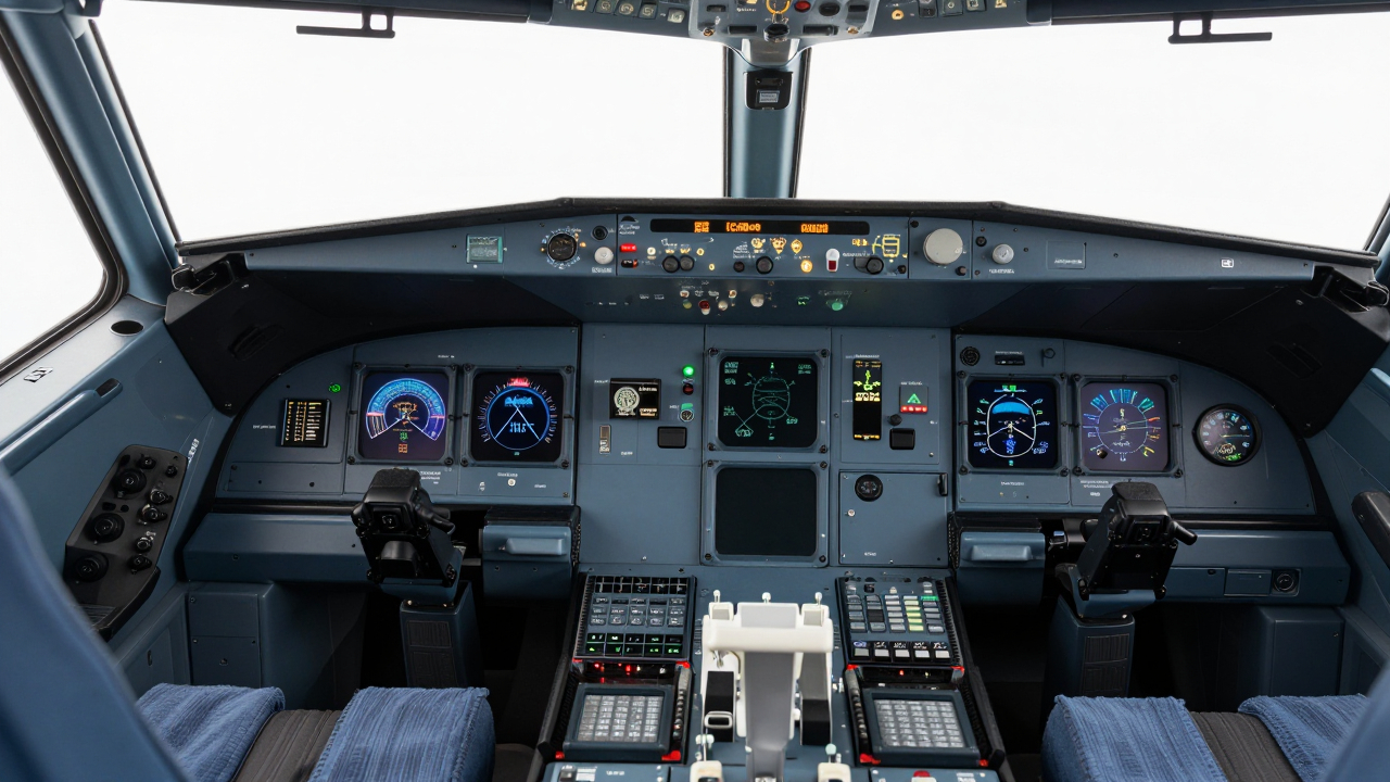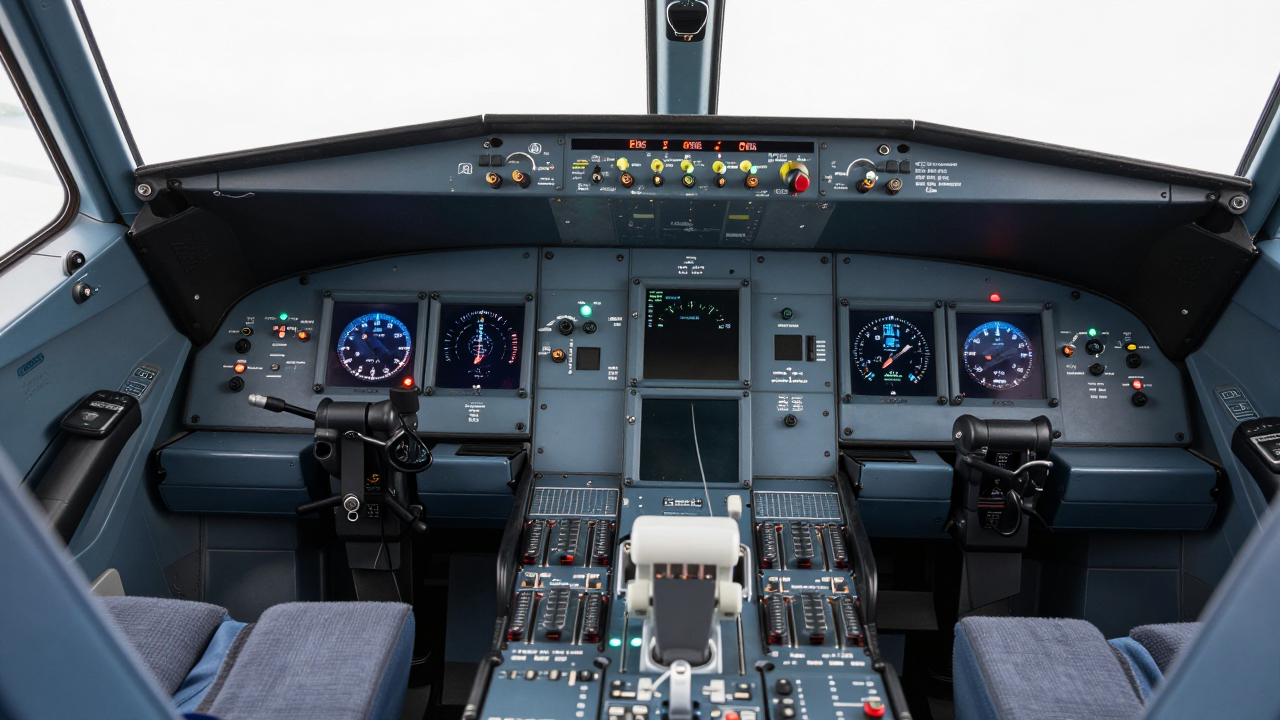 Пульт управления самолётом в кабине, множество приборов и кнопок.