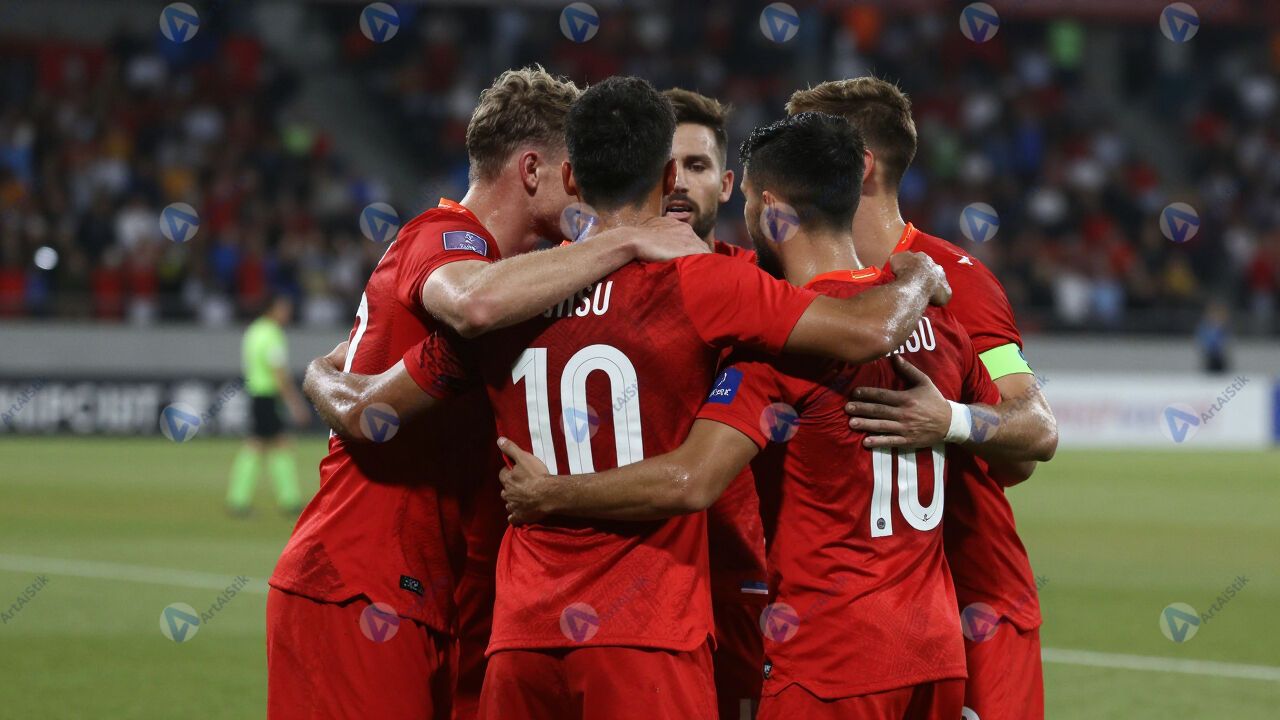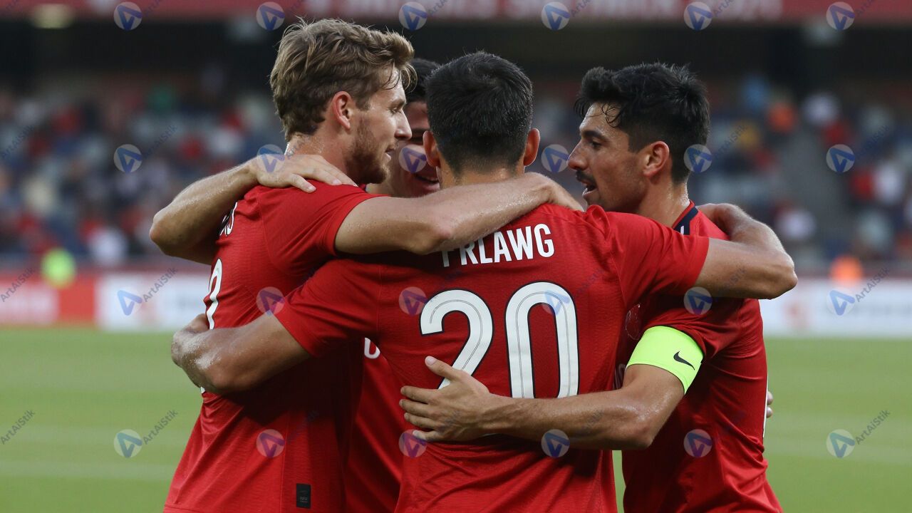 Футбольная команда обнимается после победного матча.