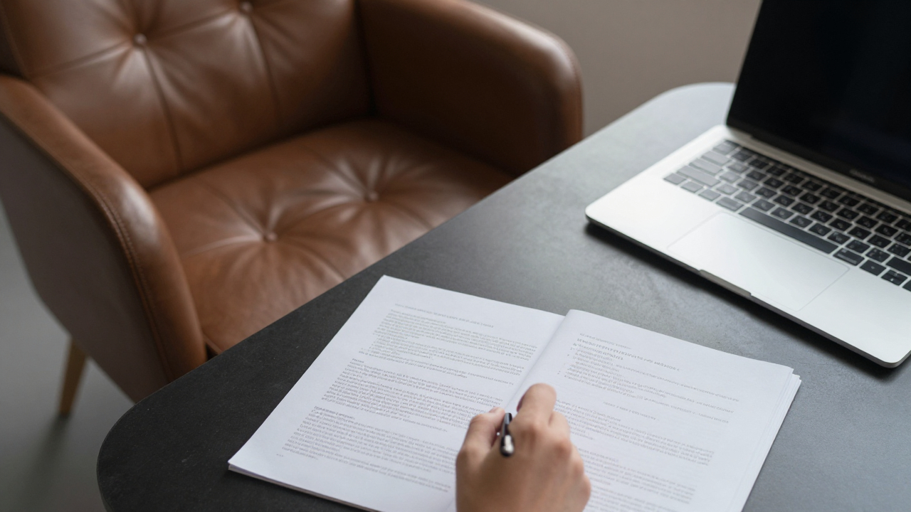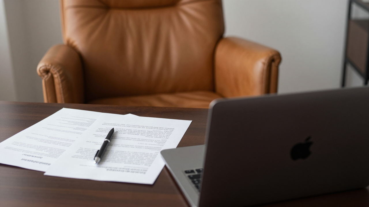 Стол руководителя, кожаное кресло, ноутбук и документы.