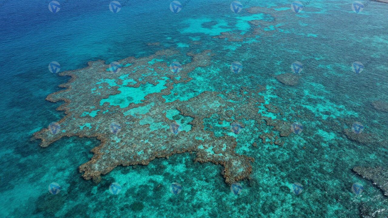 Океан с высоты, бирюзовые отмели, тёмная глубина.