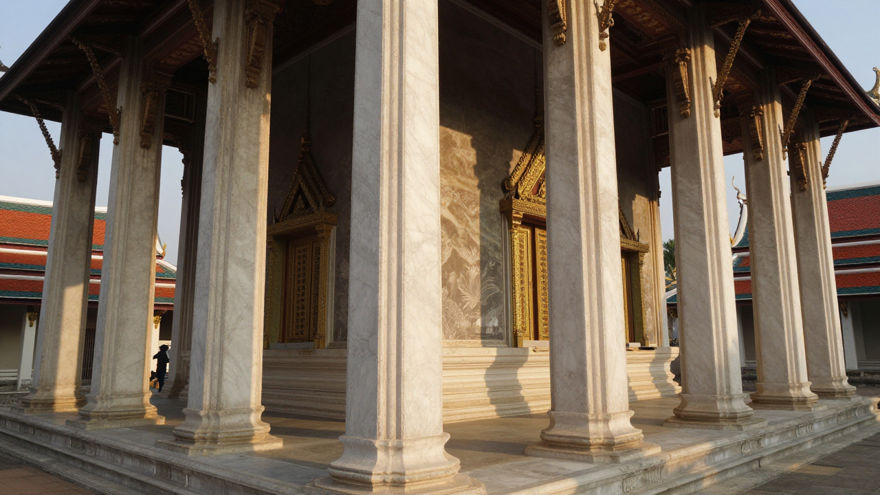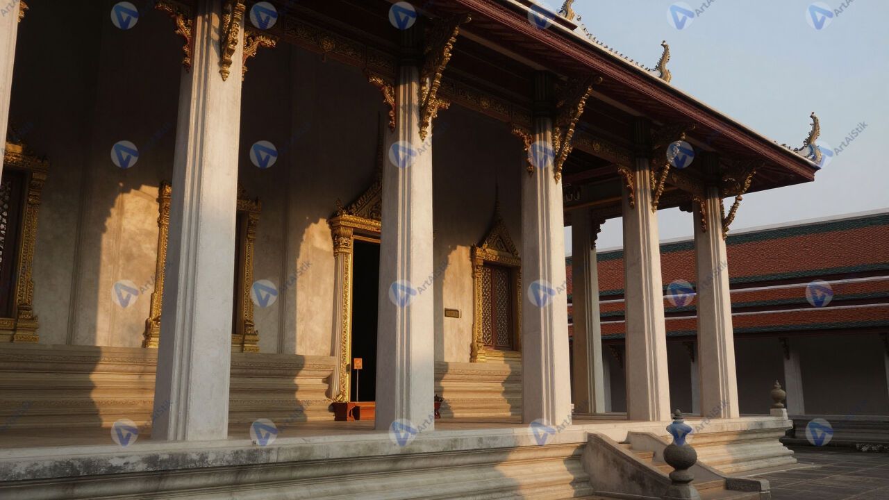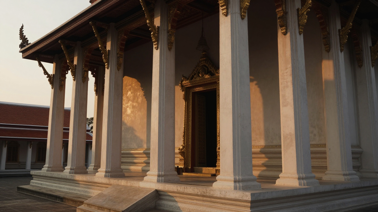 Старый храм с колоннами, золотой час.