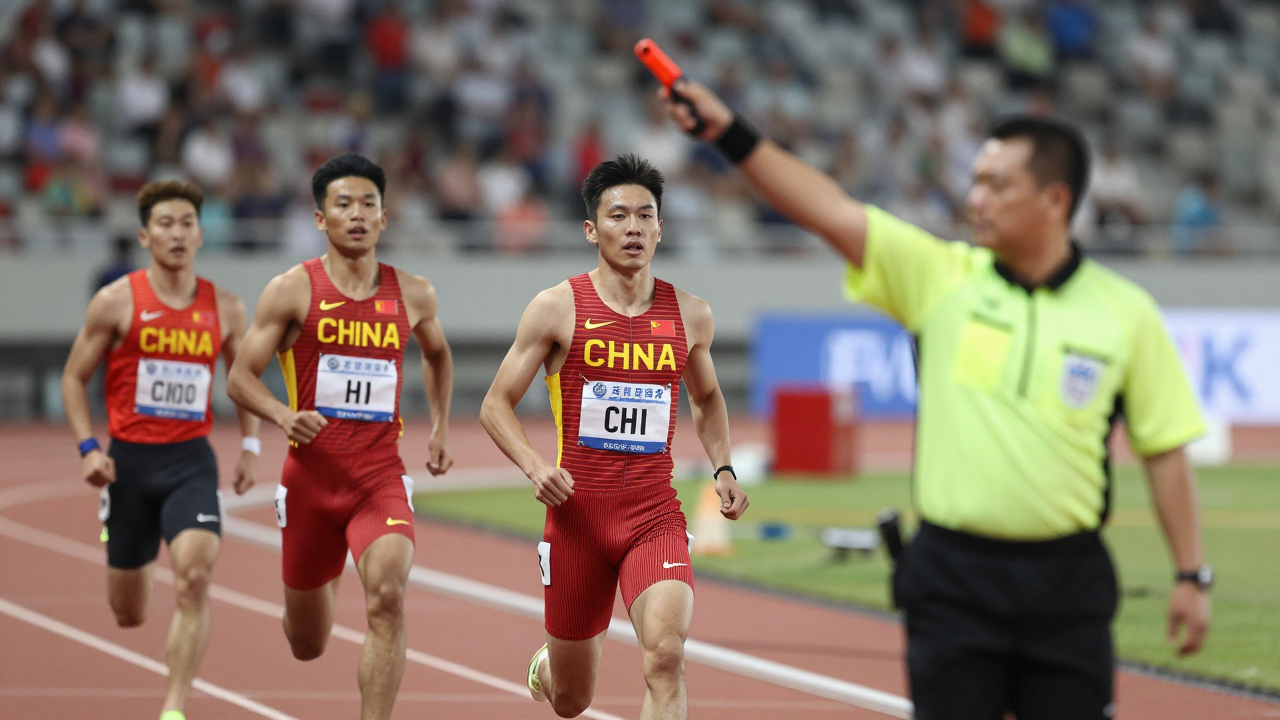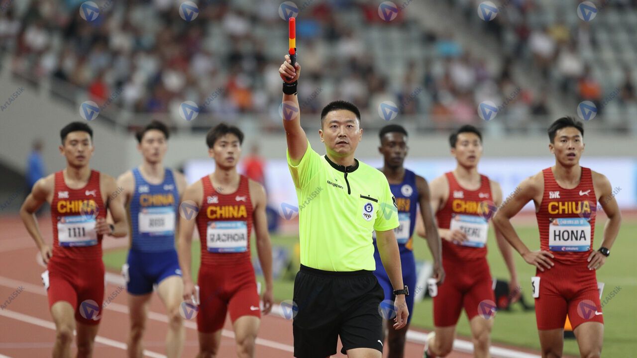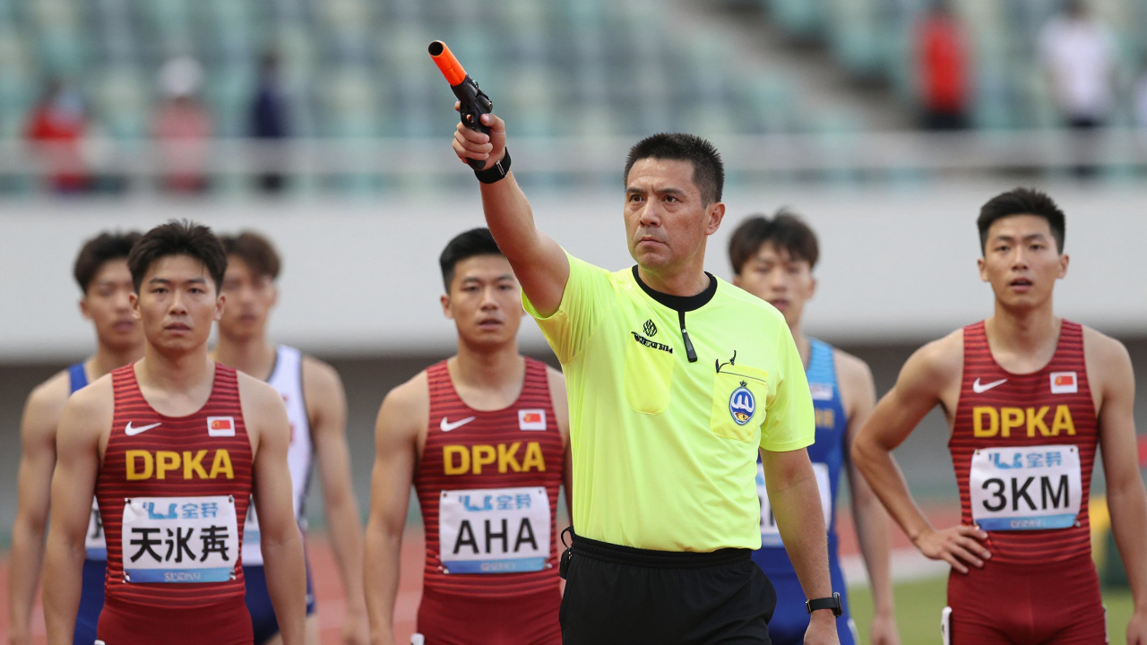 Судья поднимает пистолет для старта, спортсмены в напряжении.