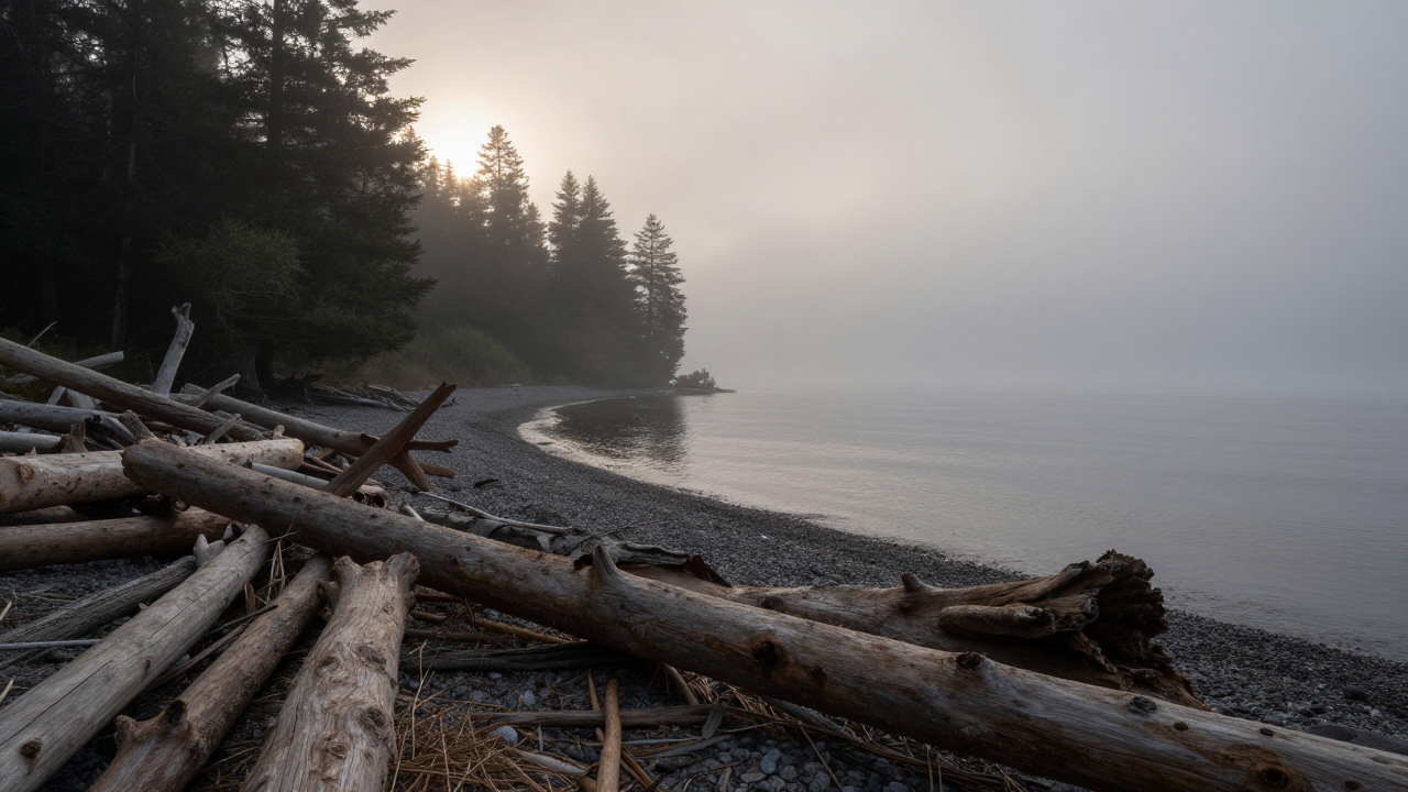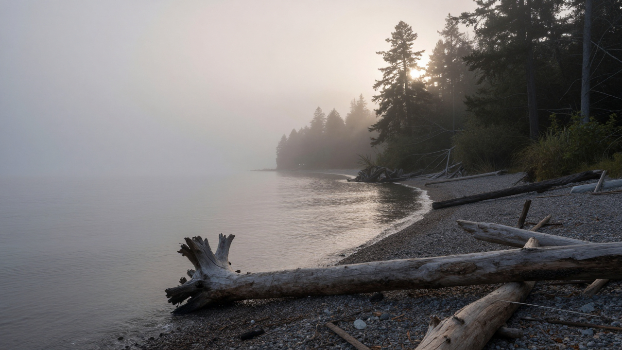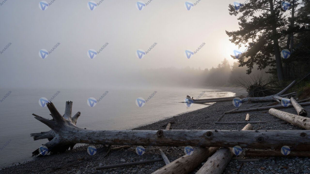 Берег с корягами, туман, силуэты деревьев.