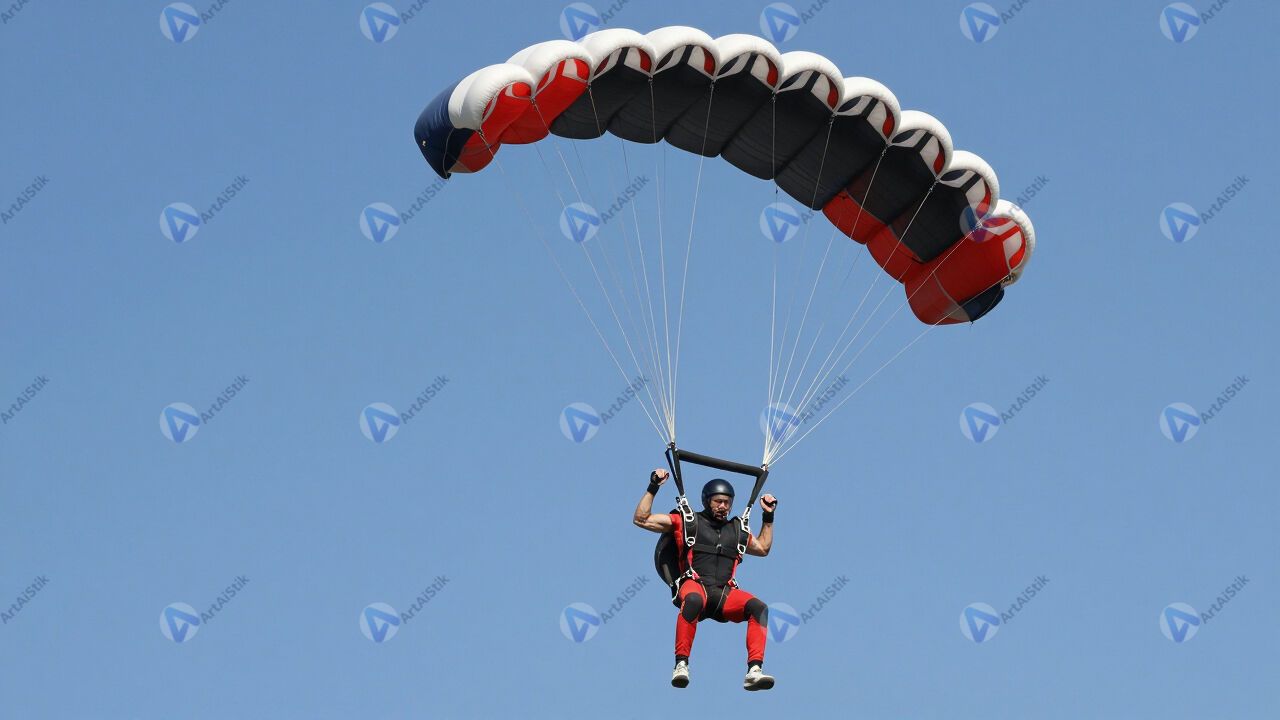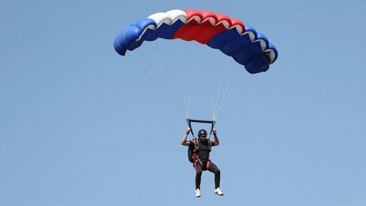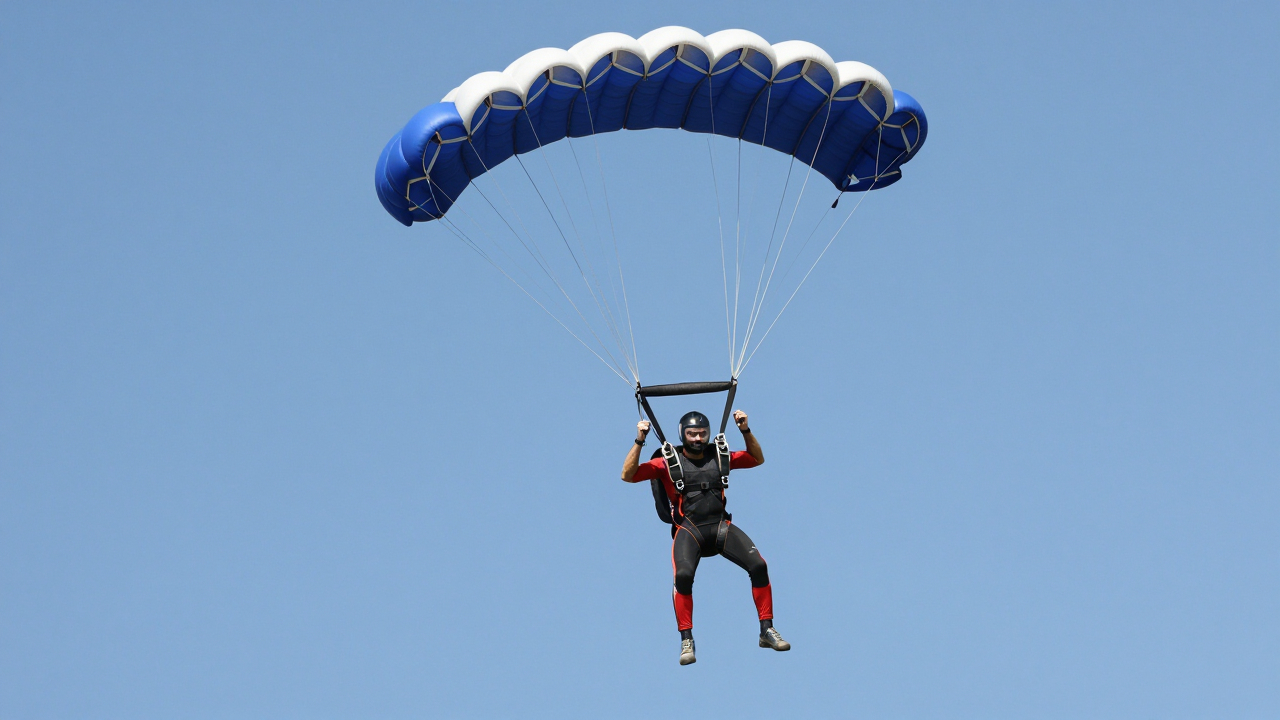 Скайдайвер раскрывает парашют в небе, купол разворачивается.