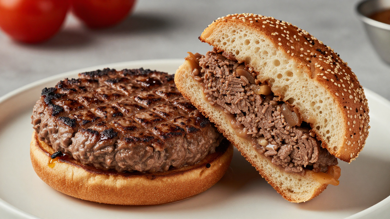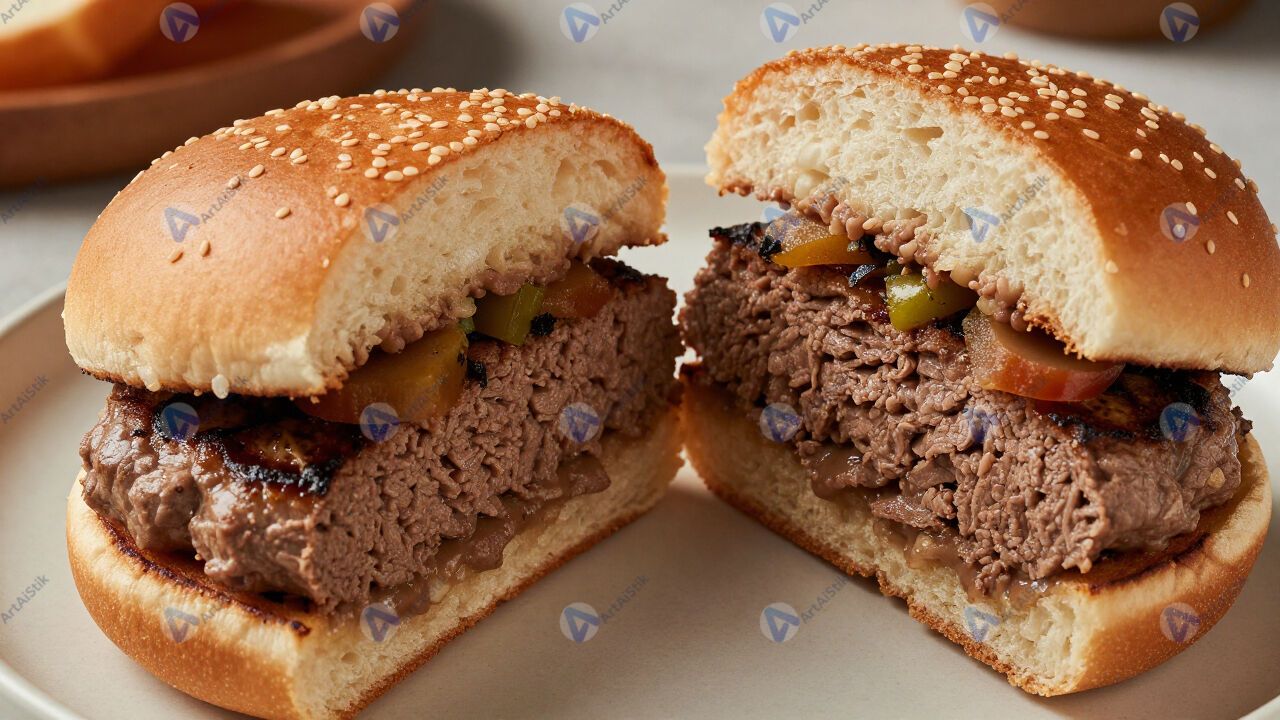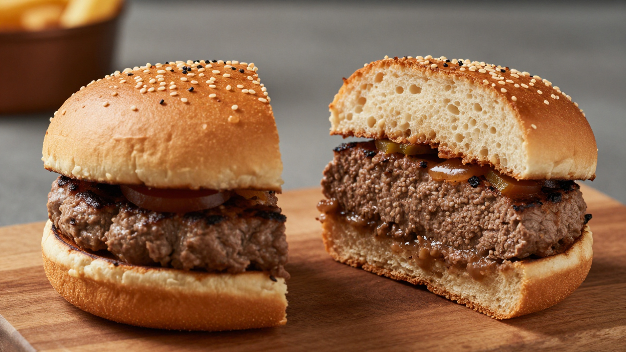 Стейк‑бургер разрезан пополам, видно начинку.