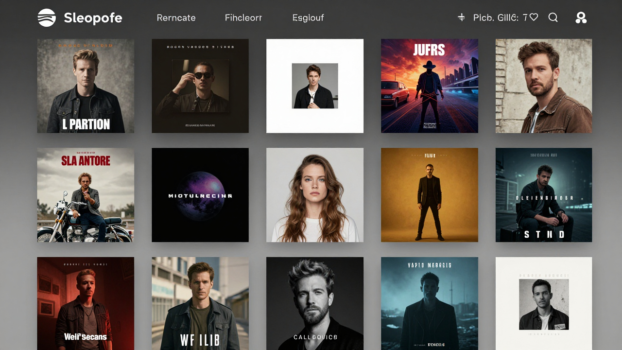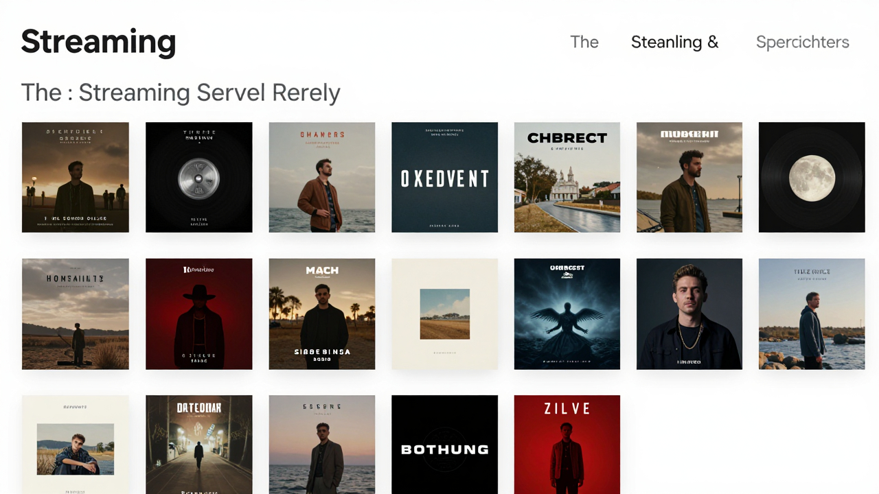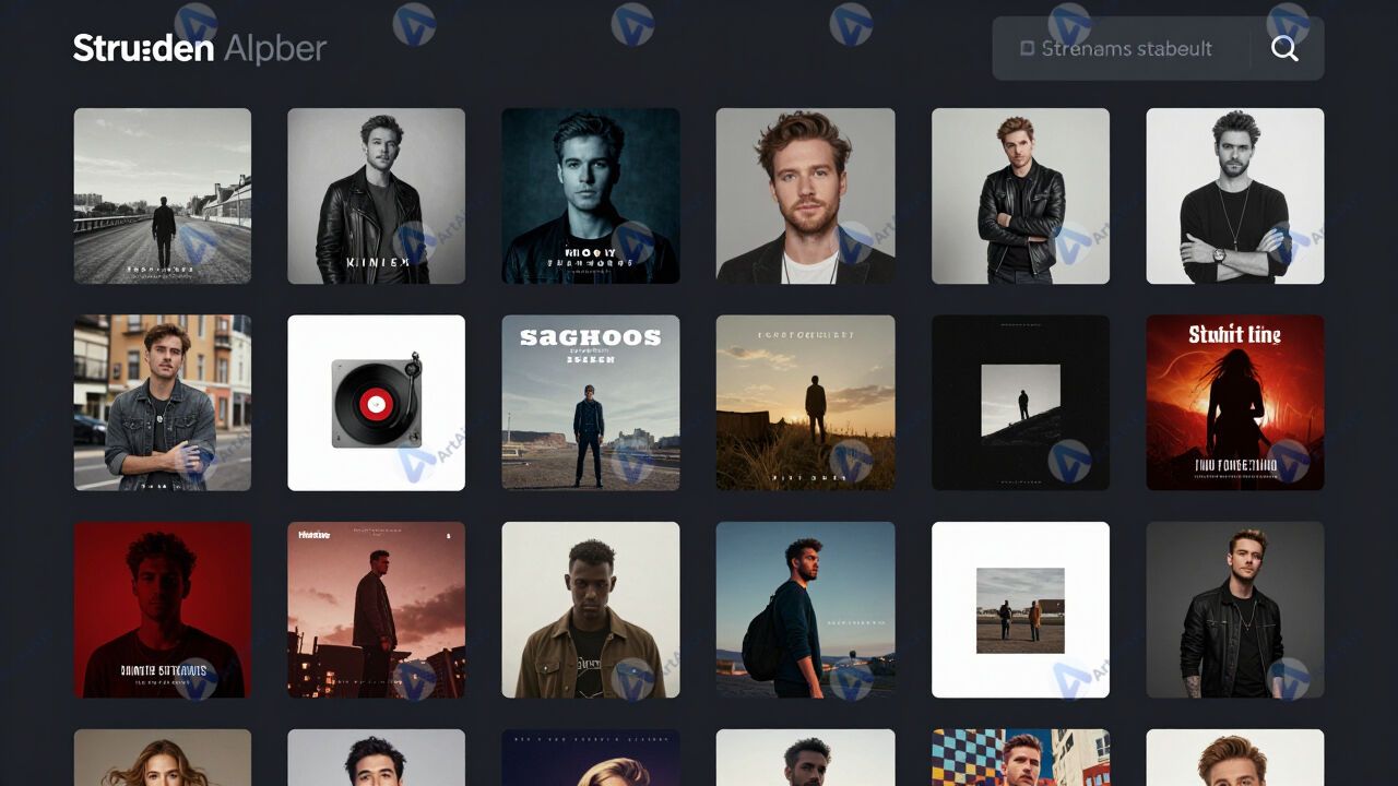 Экран стримингового сервиса, обложки альбомов в сетке.