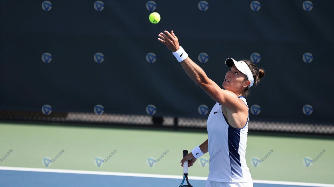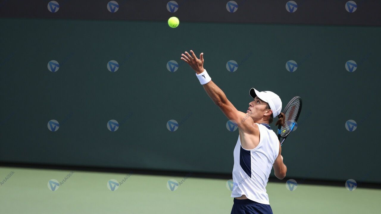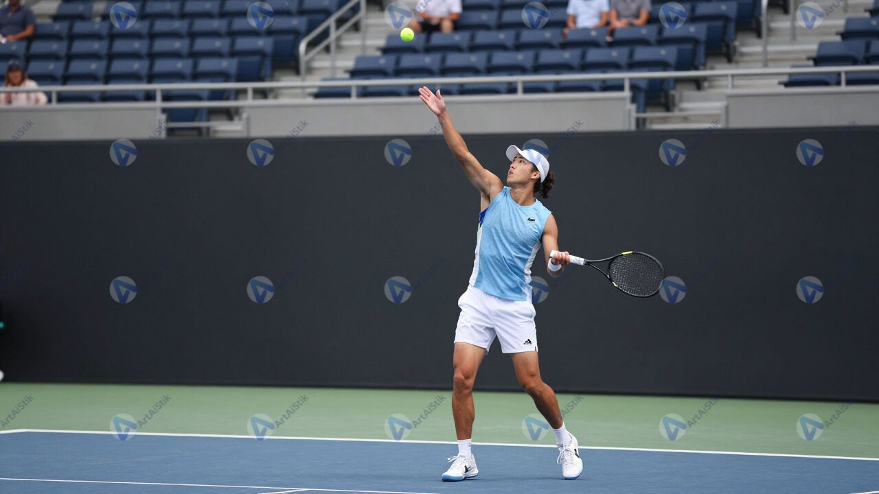 Теннисист подбрасывает мяч перед подачей.