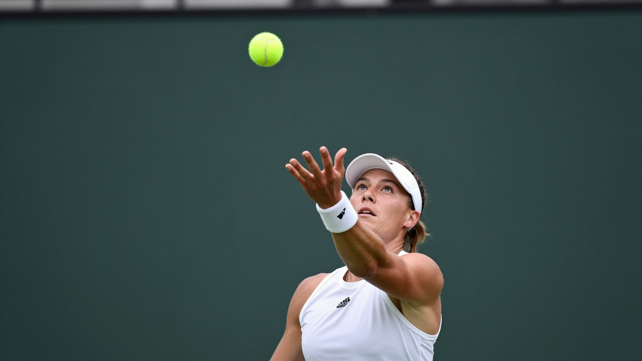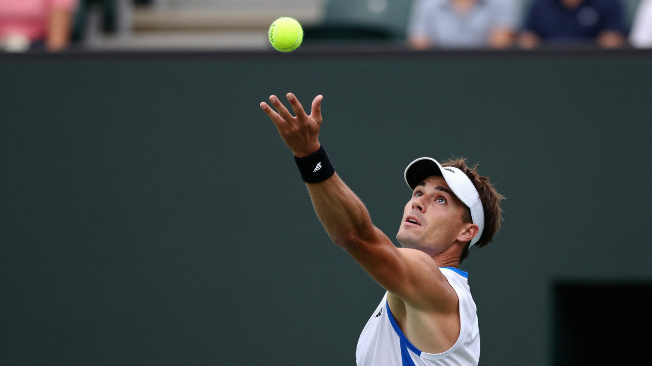 Теннисист подбрасывает три мяча, выбирая один для подачи.