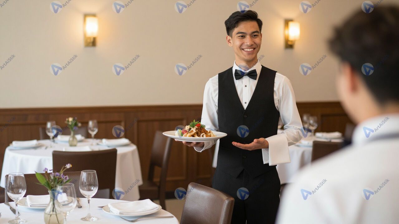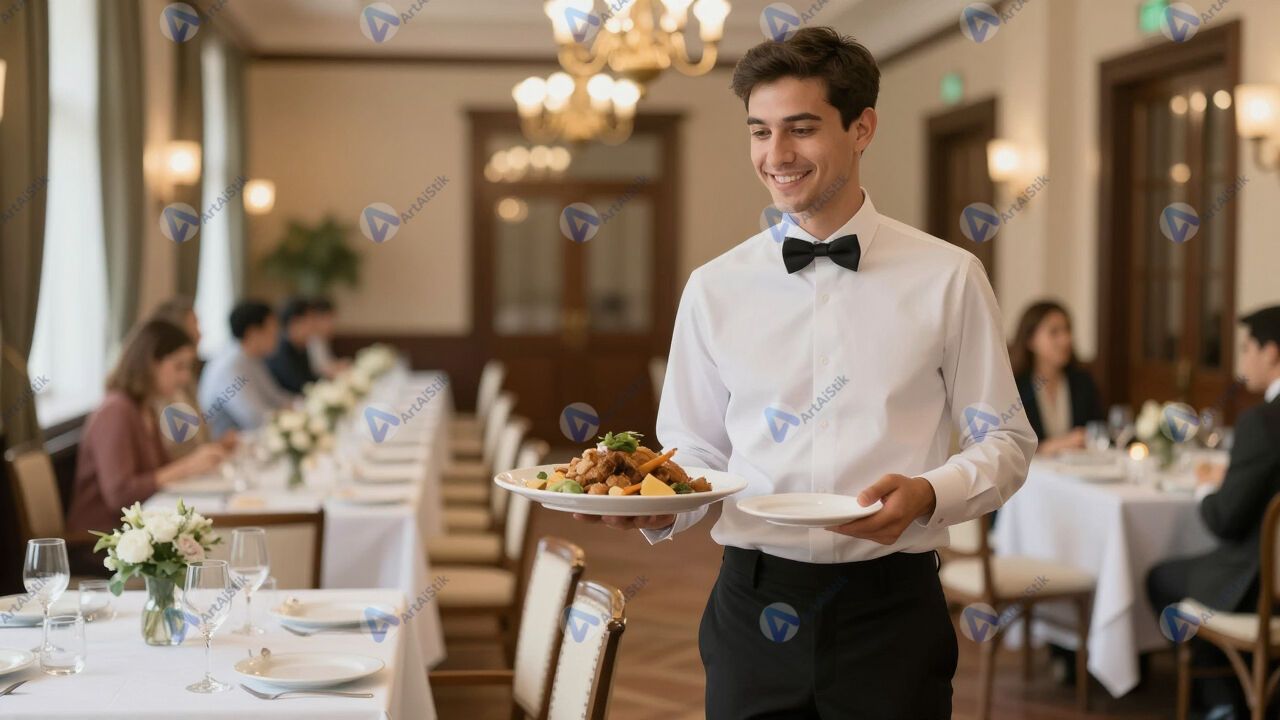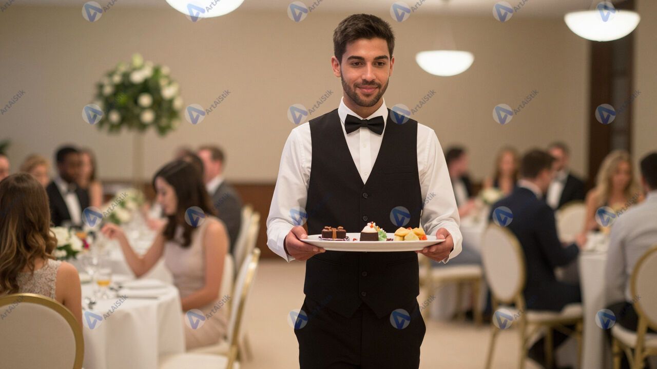 Официант несёт блюдо в зал.