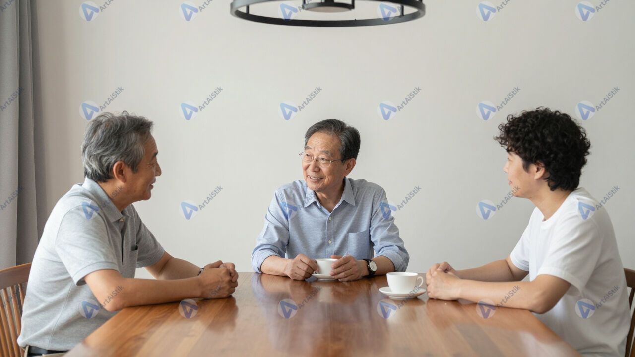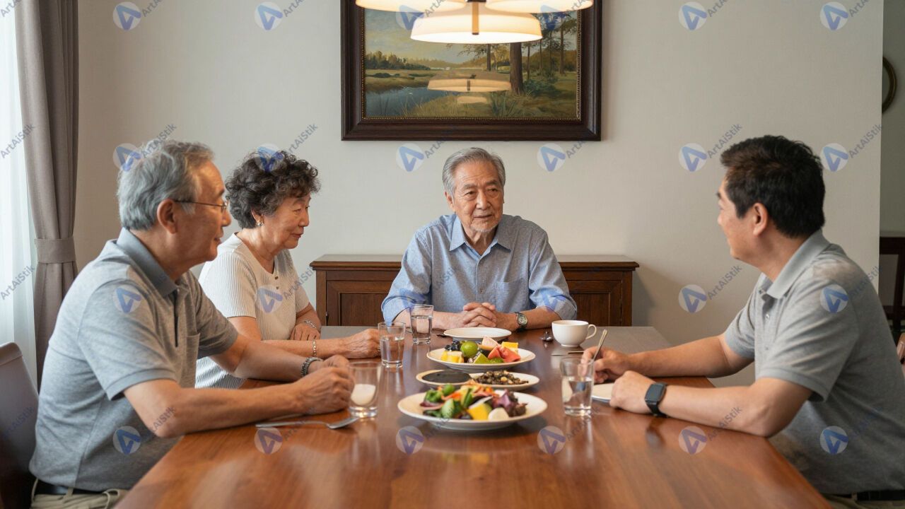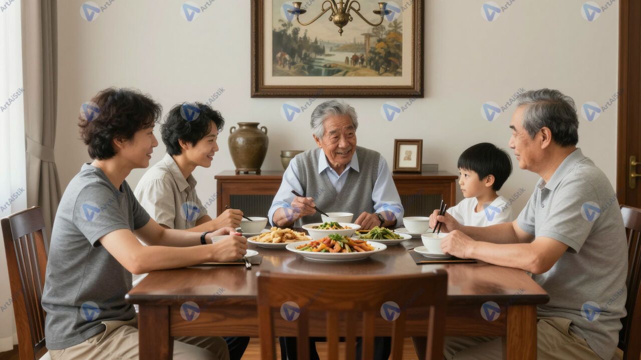 Трое поколений семьи сидят за большим столом в столовой.