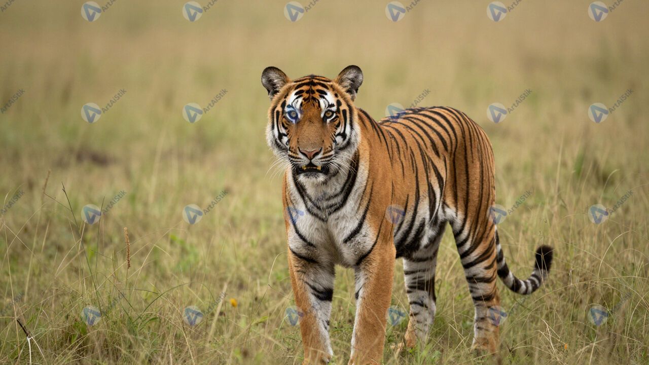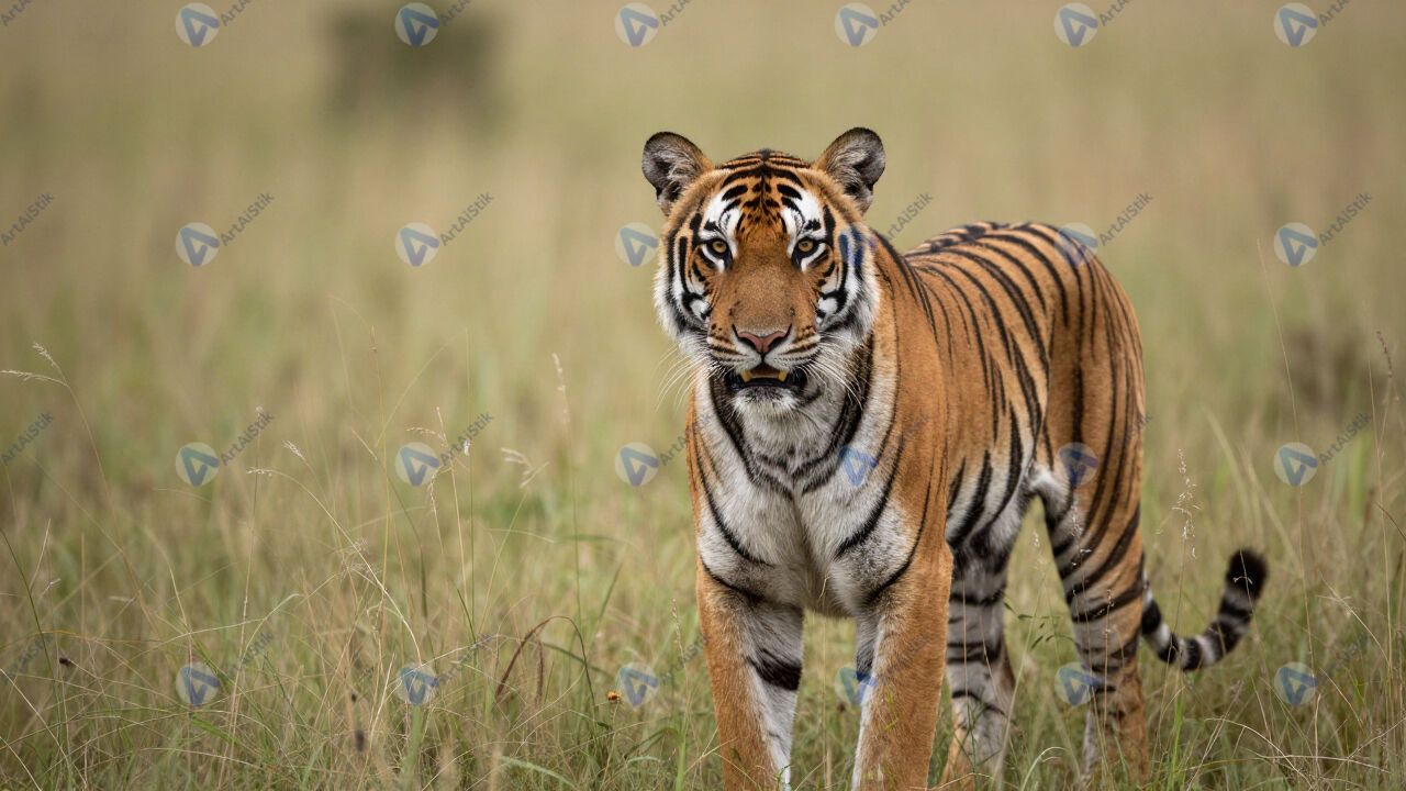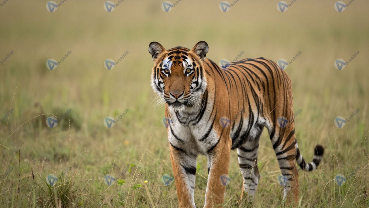 Тигр в высокой траве, взгляд в камеру, саванна.