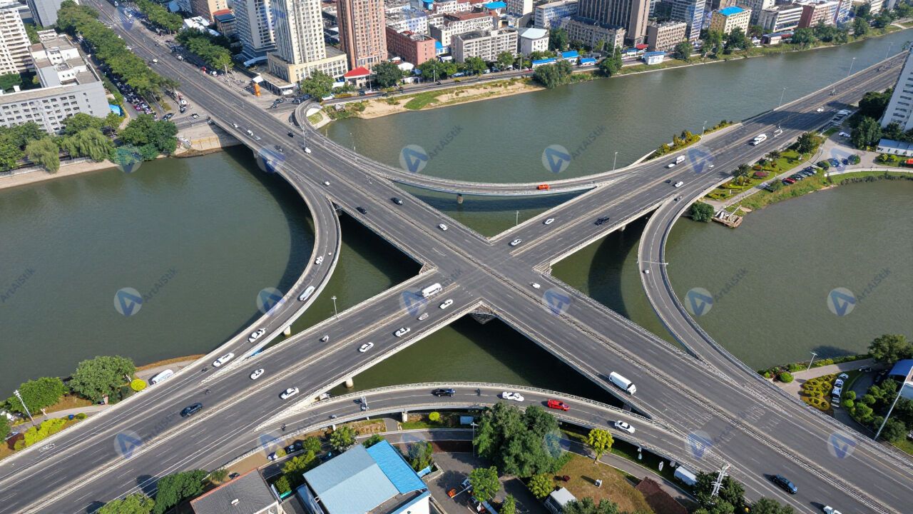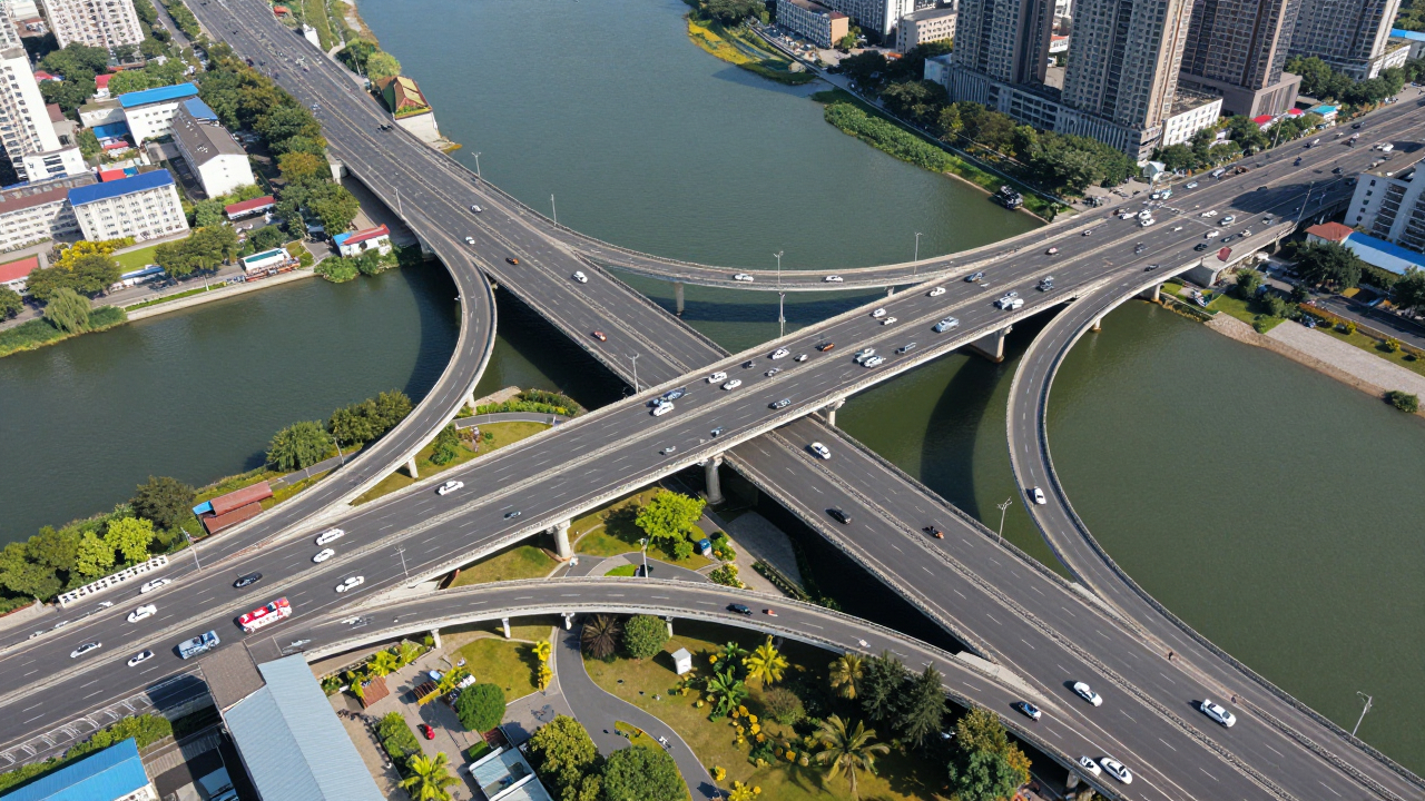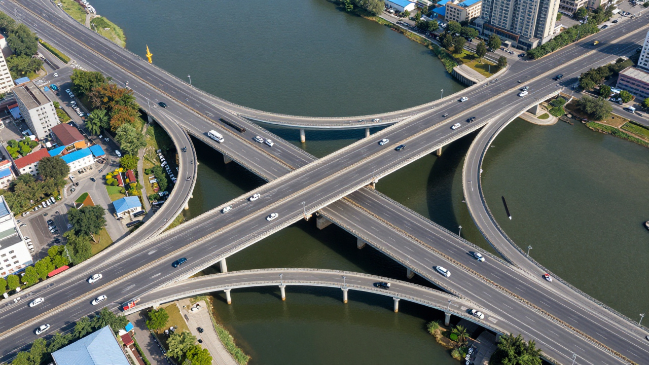 Транспортная развязка у моста через реку, вид с воздуха.