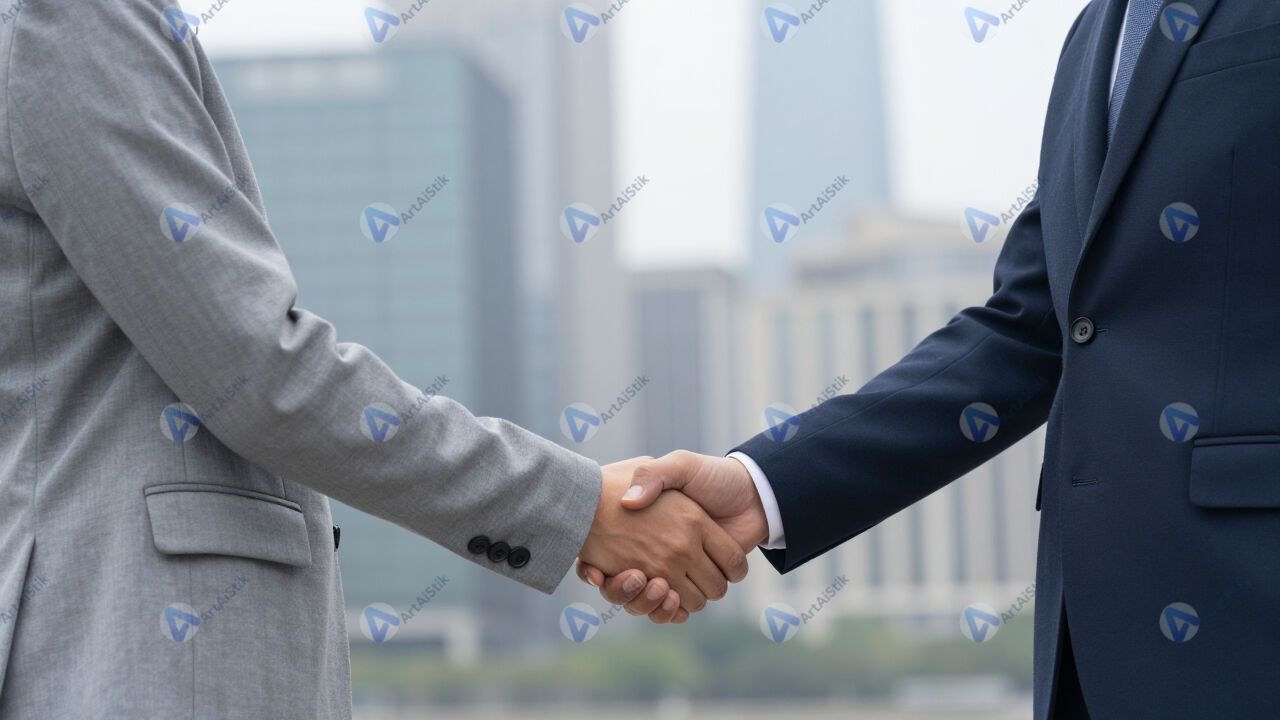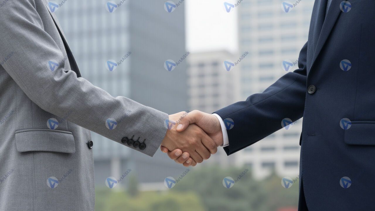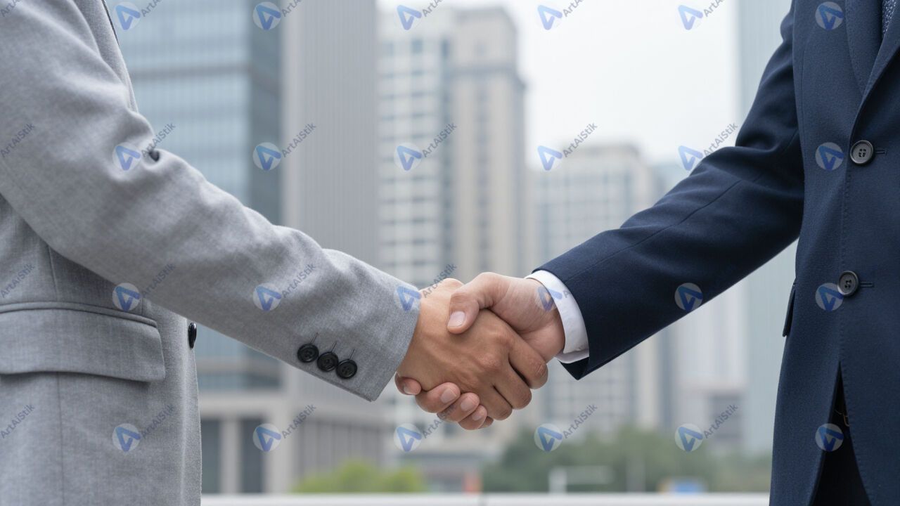 Двое коллег обмениваются рукопожатием на фоне города.