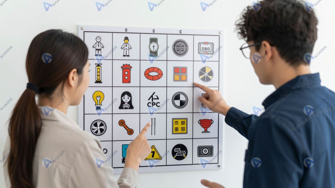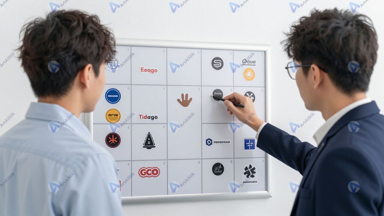 Два сотрудника обсуждают стикеры на панели Kanban.