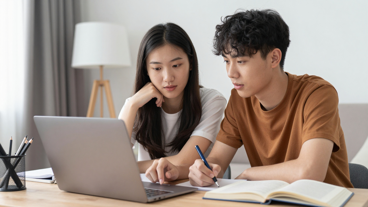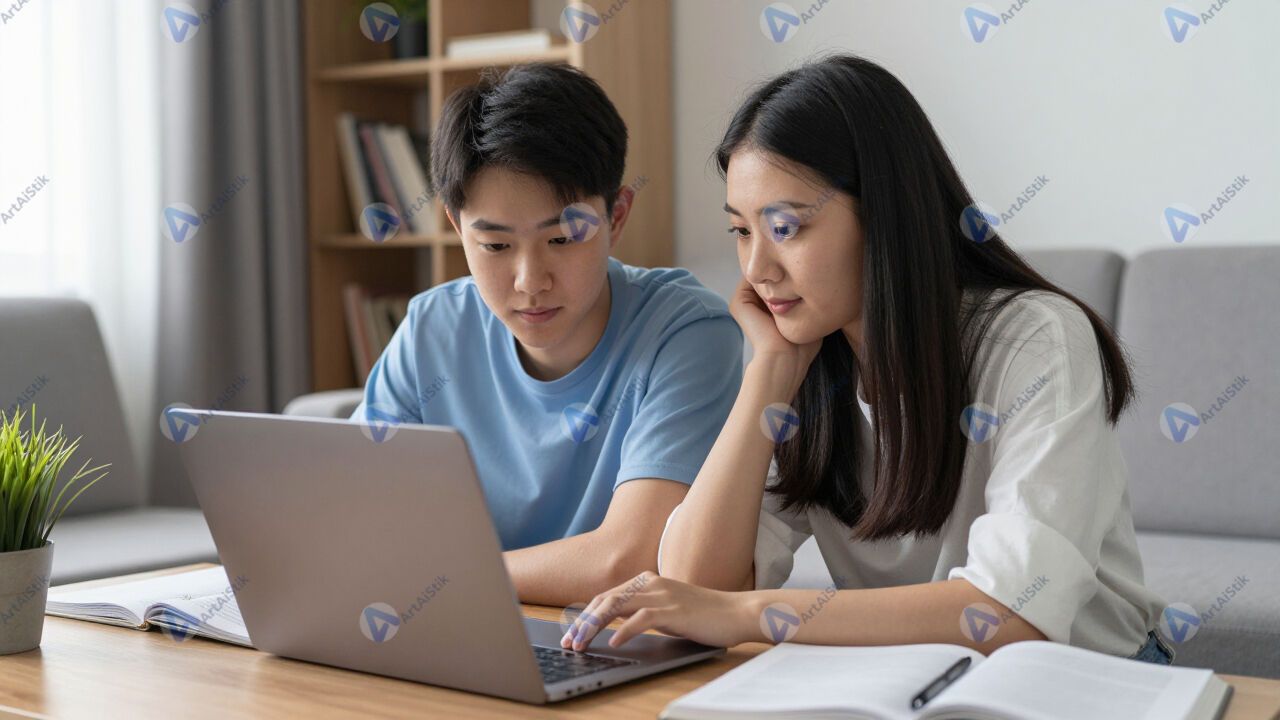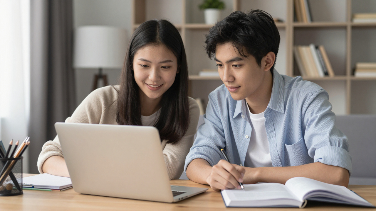 Двое подростков с ноутбуком, совместная учёба дома.