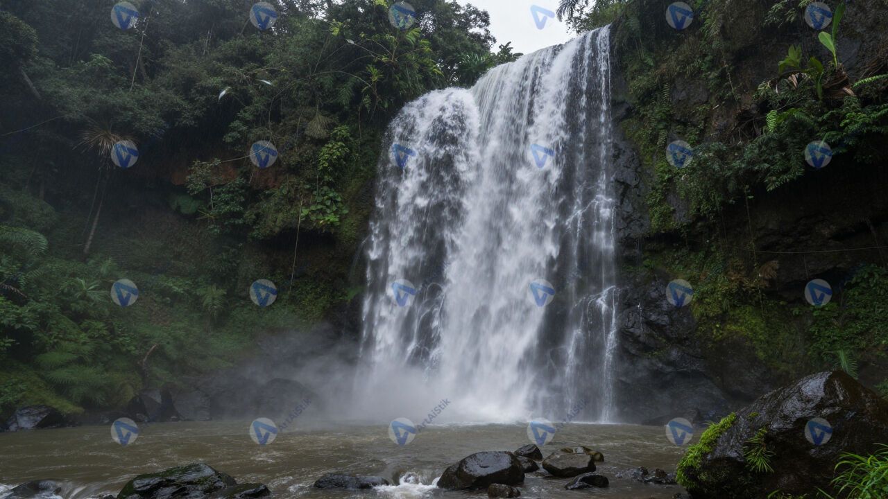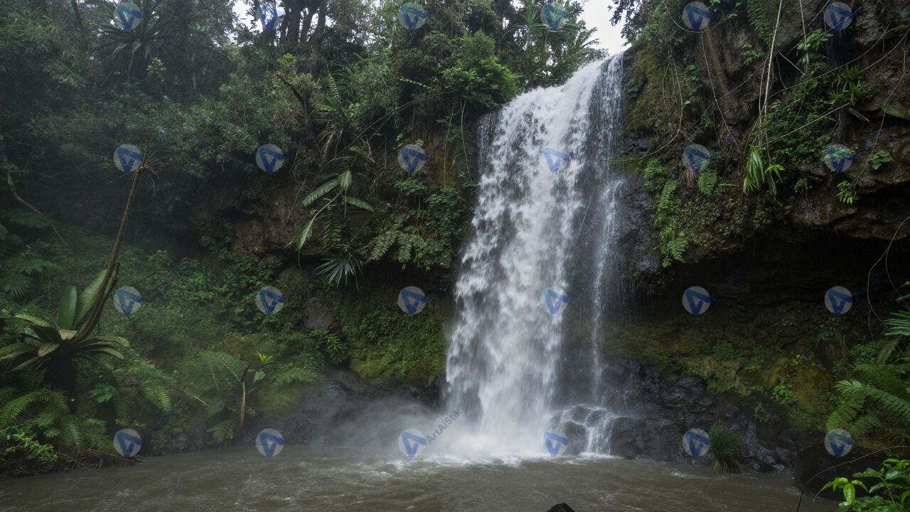 Водопад в тропическом лесу, струи воды, зелень вокруг.