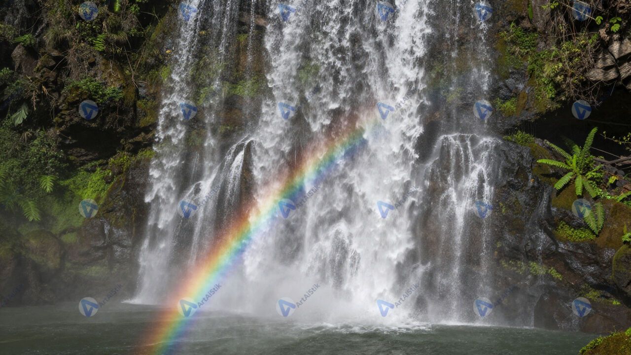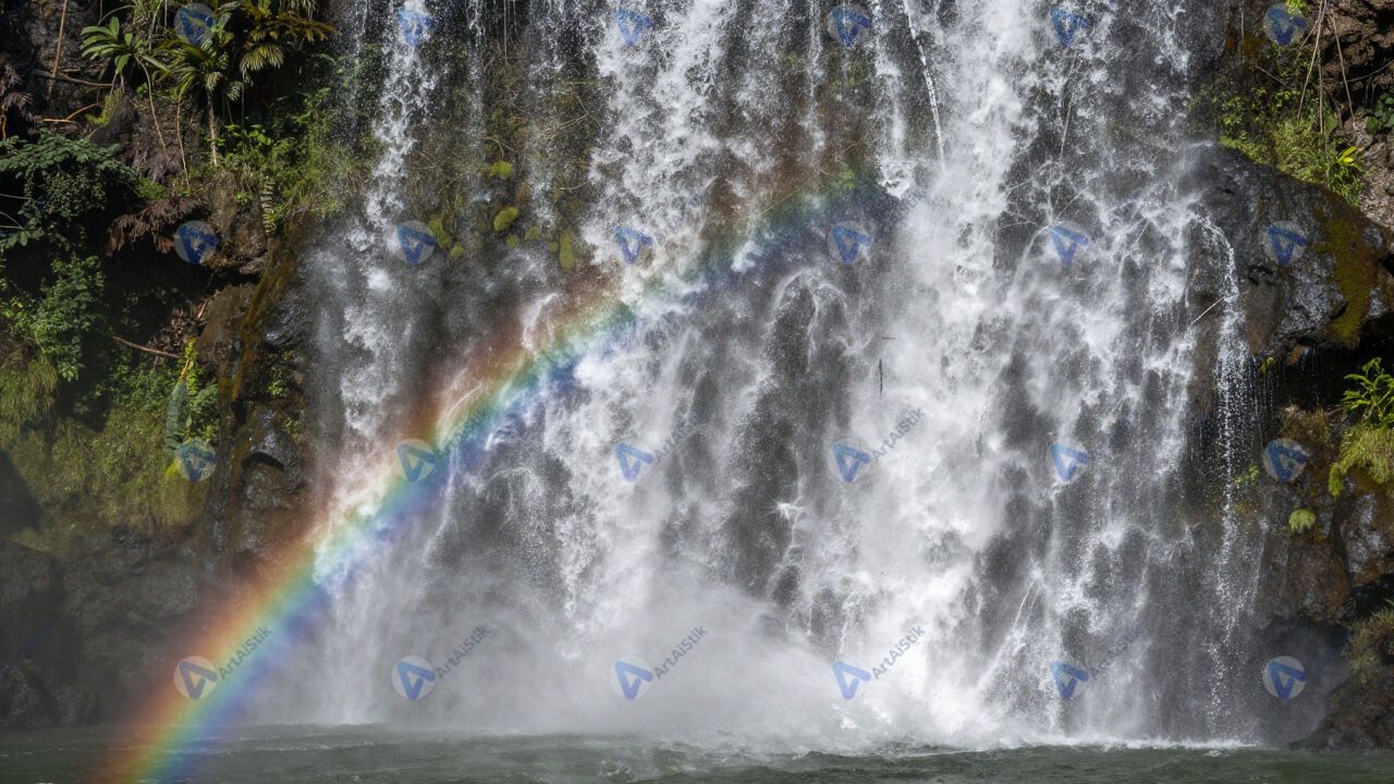Водопад с радугой в брызгах, зелень по бокам, влажный воздух.