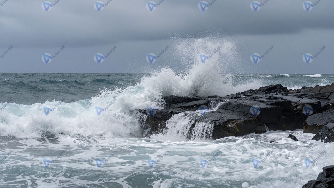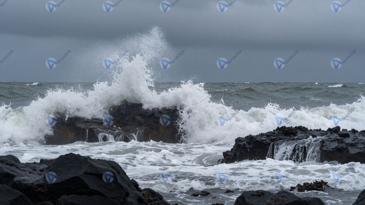 Волны разбиваются о чёрные скалы, пена, брызги, драматичное небо.