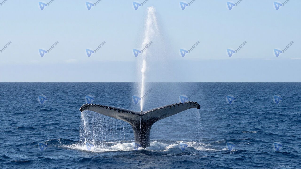 Кит выпускает фонтан, океан, ясный день.