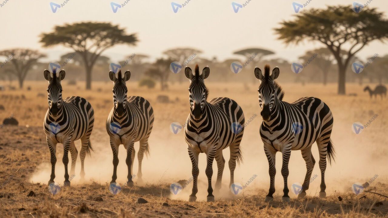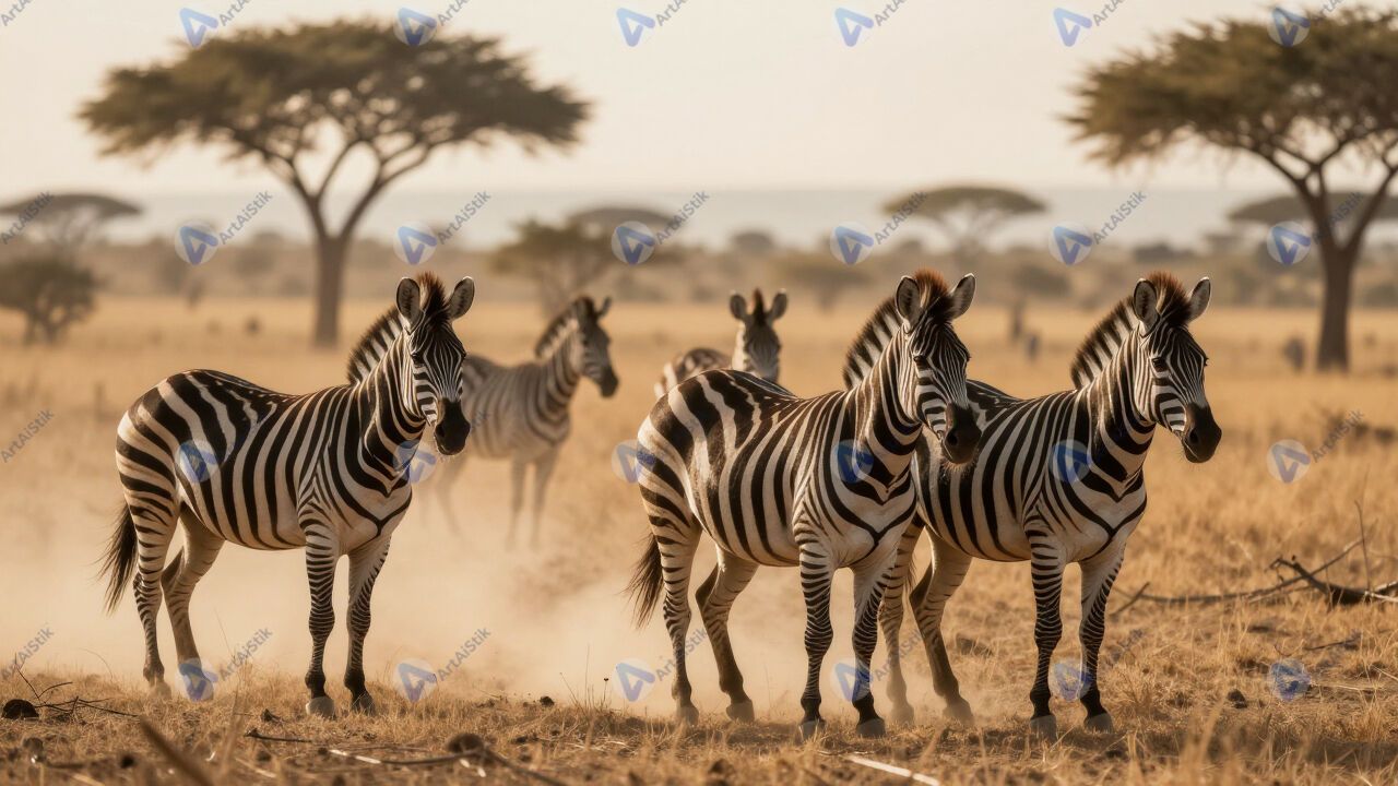 Зебры в пыли саванны, полоски, золотой час.
