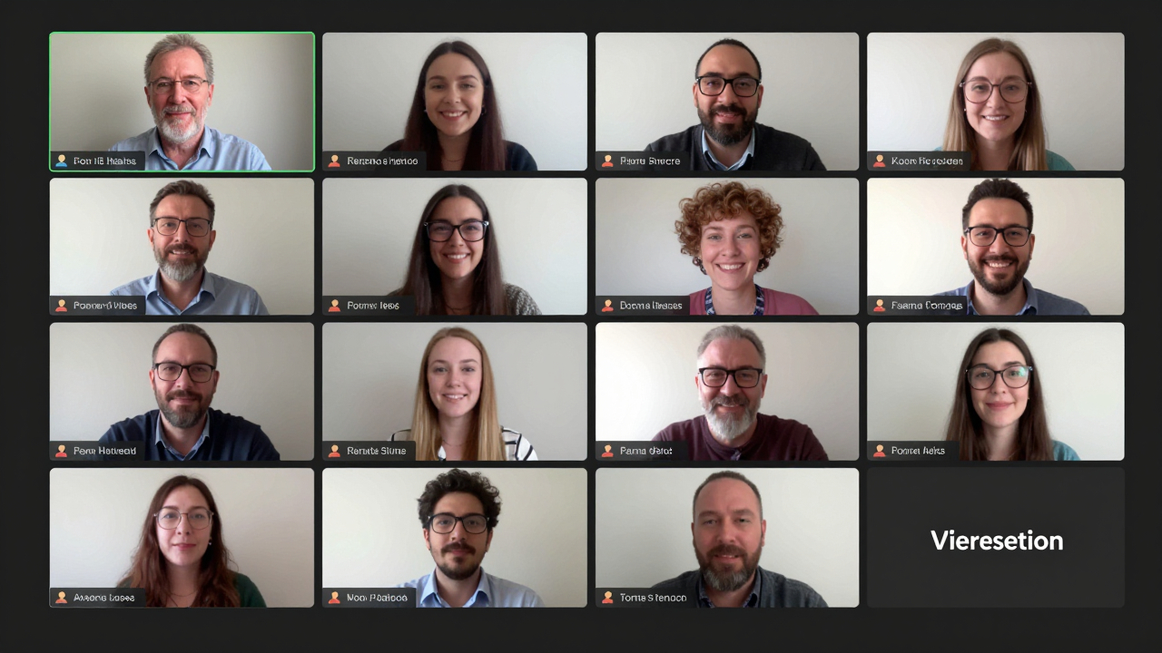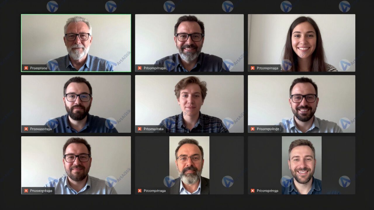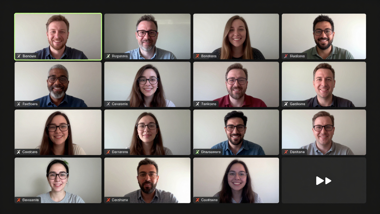 Команда в Zoom‑колле, сетка лиц на экране, разные фоны.